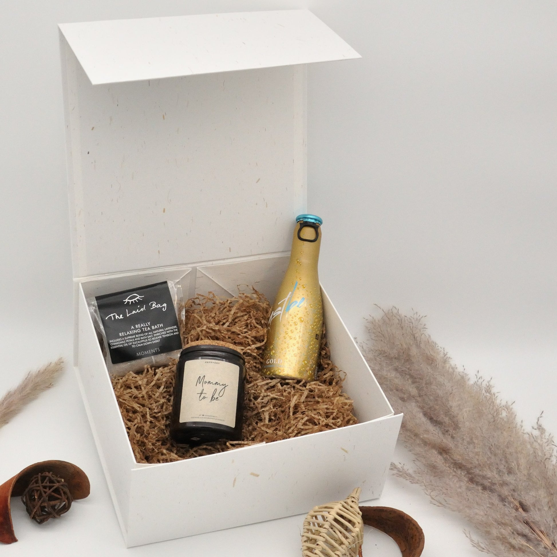 This package aims to support the future mother to help her relax. A warm bath, a nice scented candle and a glass of non-alcoholic bubbles provide the ultimate moment of relaxation.