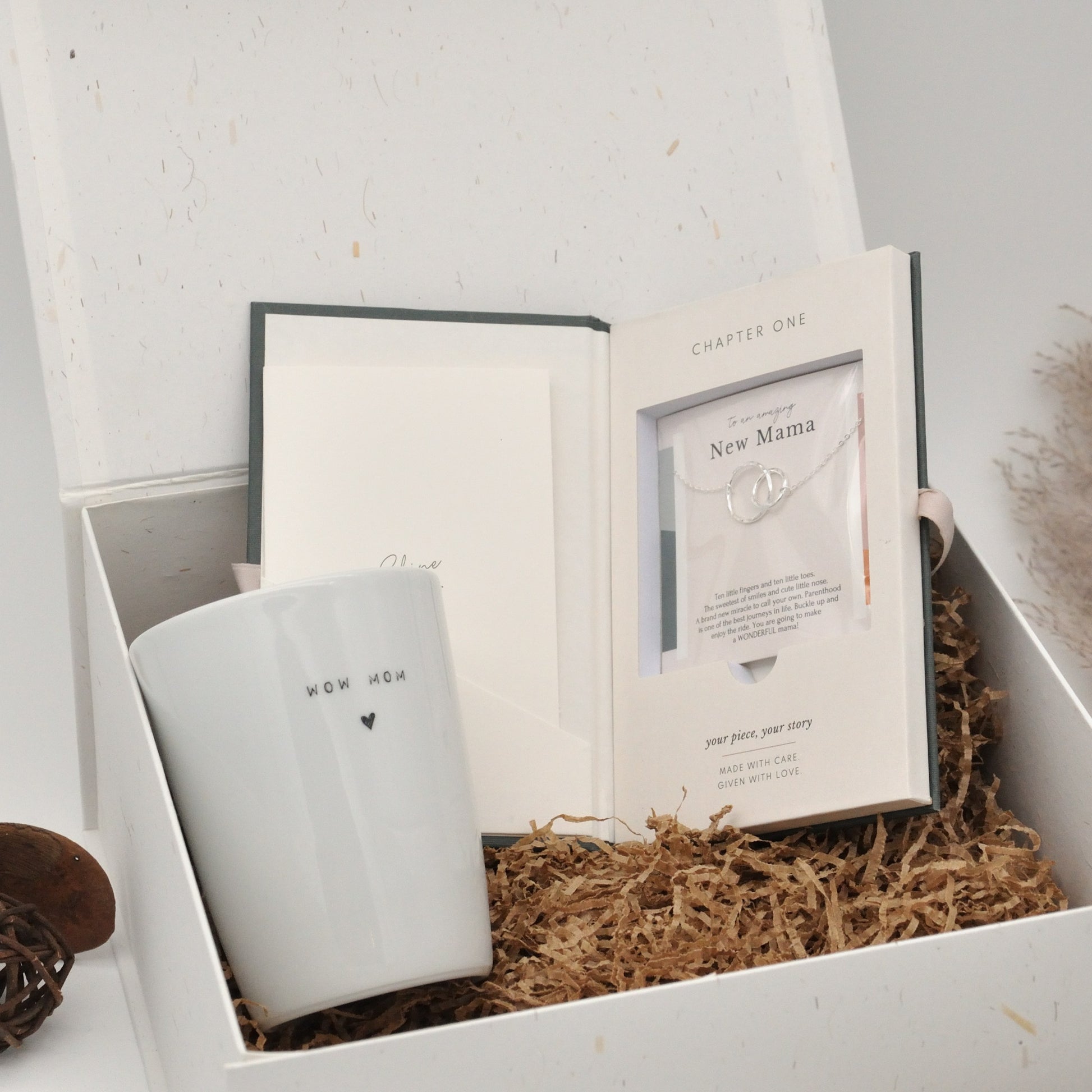 All our gift boxes are offered and shipped in a luxury gift box , which can be given directly to the (future) mother. In addition, you can add a card with your own text that will be handwritten by the Wowwy team.