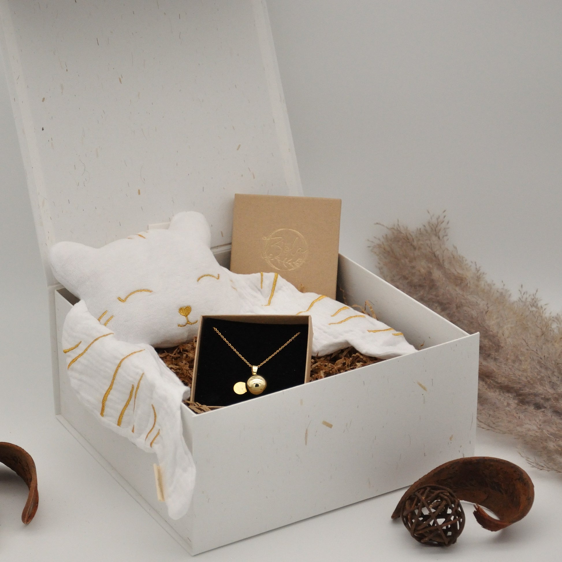 Die Geschenkbox hat eine weiße Oberfläche mit Strohakzenten und einer beigen Satinschleife und enthält Produkte, die wunderschön in weißes Seidenpapier mit Blumenmuster eingewickelt sind. Die 23 cm x 23 cm x 11 cm große Box mit Magnetverschluss kann wiederverwendet werden, um Babyerinnerungen aufzubewahren.